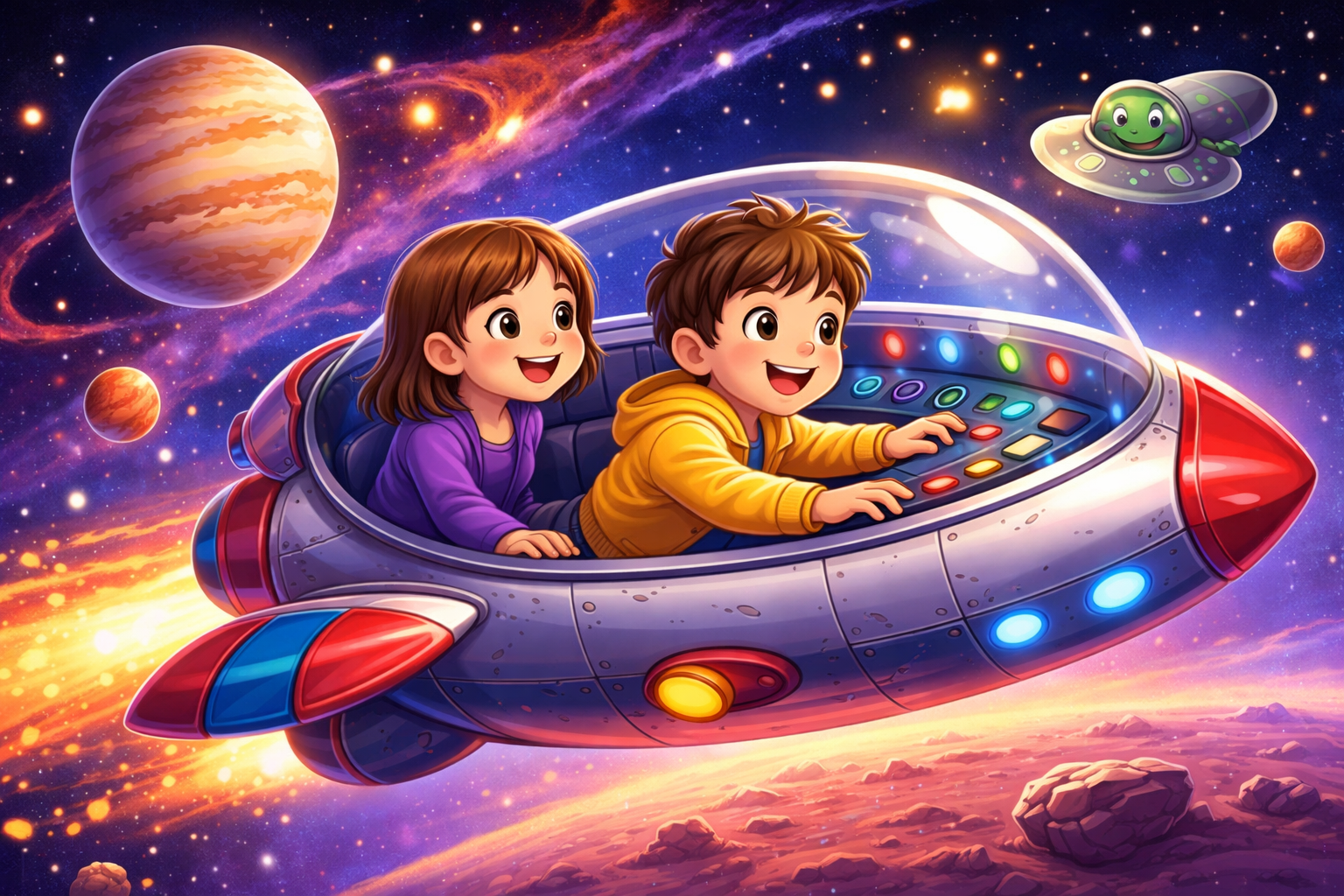وفجأة بدأ الصّاروخ يتحرّكُ بسرعة، وأخذ سامي ومريم إلى الفضاء.